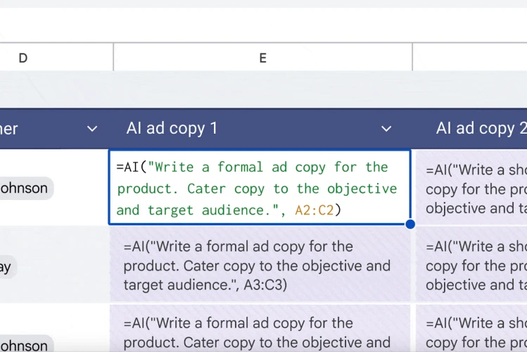Dengan menggunakan fungsi =AI(...), kamu bisa memberikan perintah ke AI untuk menulis teks yang relevan berdasarkan data dari sel yang kamu tentukan. Misalnya, kamu bisa membuat Gemini menulis iklan formal berdasarkan data target audiens dari A2 sampai C2 cukup dengan: